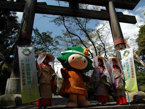 平安期の熊野詣装束に身を包んだ女性3名と共にやってきたキノピーは、神前で玉串拝礼を行い、平成23年に開催される、第62回全国植樹祭の成功祈願をしました。
