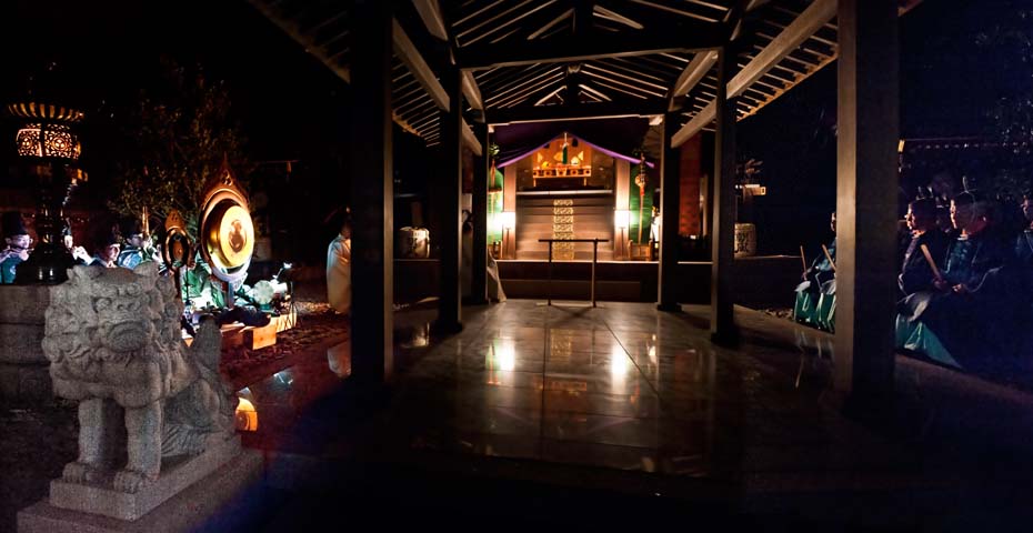 そして、出御 になると、全ての明かりが消されて松明の明かりの中、行列はゆっくりと本殿に向けて進みます。
