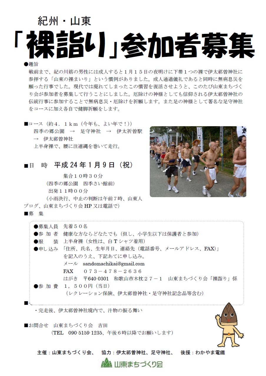毎年1月15日の夜明け前、下帯1つの上半身裸という格好で伊太祁曽神社に参拝する 「山東の裸詣り」 という風習が戦前まで行われていました。