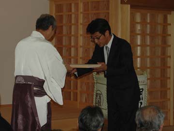 引き続き、今回の工事を行いました業者に感謝状の贈呈が行われ、その後、鏡開きとなり、乾杯を致しました。