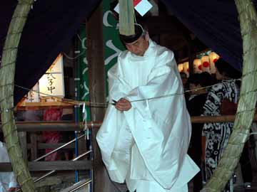 次に、宮司が大茅輪の前に進み出て、茅輪に掛けられている注連縄を切り開きます。