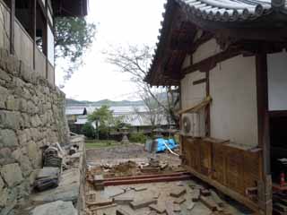左の写真は、移動中の授与所と割拝殿の石垣です。