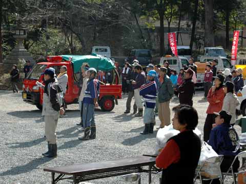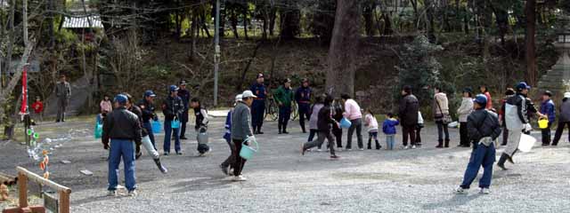 実は朝から、地元の自治会による防災訓練が、境内で行われました。 地元消防団と消防車も出動し、火事が発生した場合の、バケツリレーの練習 や 消火器の使い方 について、体験してもらっていました。 また、消防署からも消防車と消防員の方にも来ていただき、指導を頂いていました。 最後は、消防車による放水実演が行われました。 最初の写真は、この放水実演の写真です。 (右の写真の消防車は消防団のものです) 伊太祈曽自治会では、来年以降も、防災訓練を行う予定だそうです。