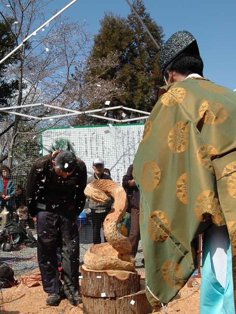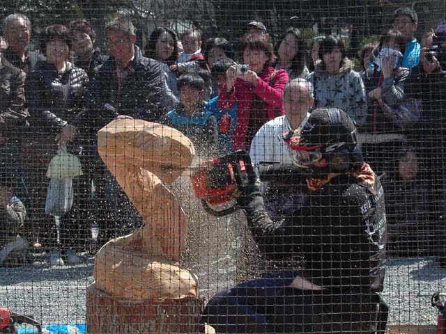 すっかり恒例となった、世界チャンピオン 城所啓二氏 による、チェンソーカービングの実演奉納。