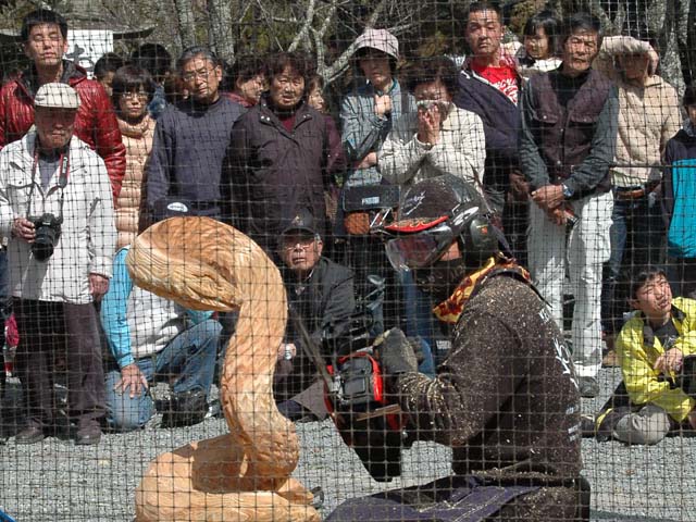 しかし、毎回60分みっちりと作品作りに集中するのではなく、ギャラリーを楽しませるような演出をしてくれます。チェンソーカービングがアメリカ生まれということが大きく関連しているのだと思います。とにかく、見ている人にも楽しんでもらう、エンターテイメントなんですね。