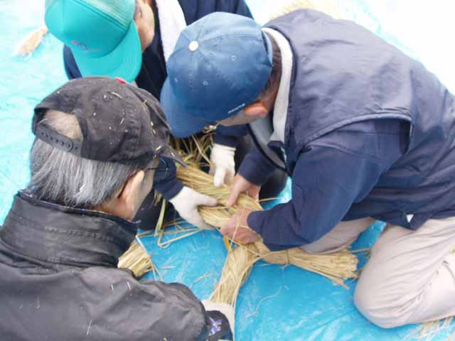 綯い手と、それぞれの束を持つ3人と、藁の補充をする人間の5名の息が合わないと、綺麗な注連縄にはなりません。