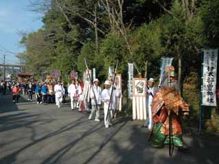 猿田彦役を先頭に、四神旗、弓などの威儀物が続きます。