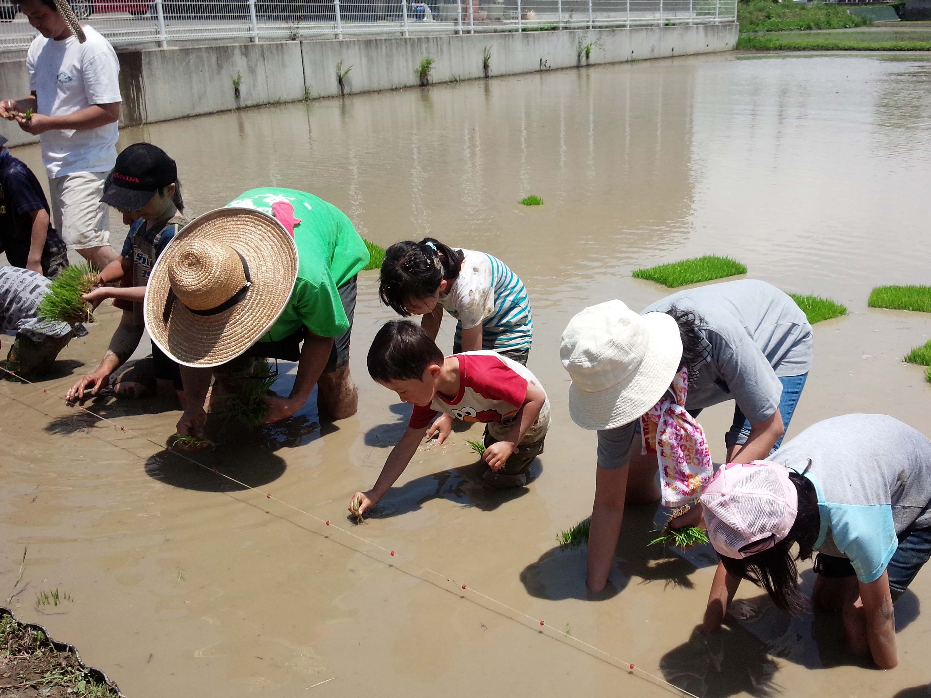 その後、再び田んぼに入り皆で田植え。水位が少し高かったので場所によっては苗が水没してしまうところもあったようですが、皆で協力して綺麗に植えてゆきました。