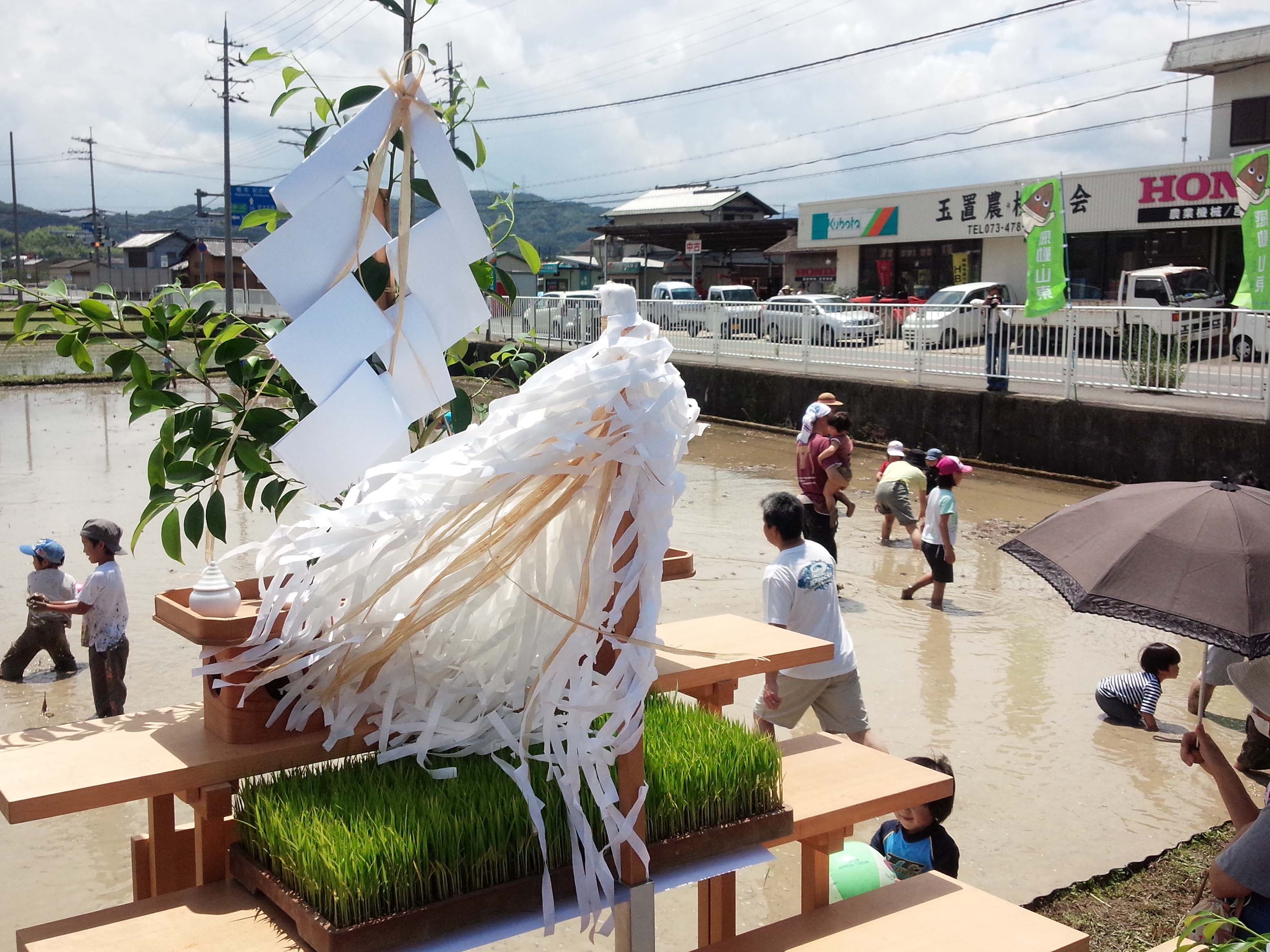 ひとしきり田んぼで泥遊びをして泥がこねられたら、これから植える稲苗が無事に育つように祈願祭を行いました。