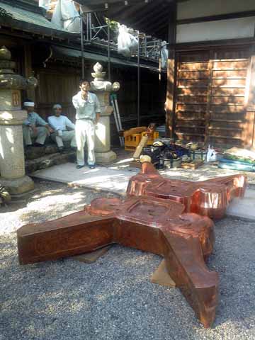 今日は このオニ のほかに、千木の取り付けも行われ、いよいよ完成が見えてきました。