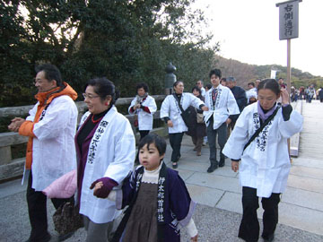 参加者は一日午前九時の月次祭に参列し、祭典後バスで出発。午後四時の渡り納め式に参加し、二十年間の感謝の気持ちを込め、一歩一歩踏みしめて宇治橋を渡りました。続いて内宮の御垣内参拝を行い宿泊の神宮会館へと向かいました。