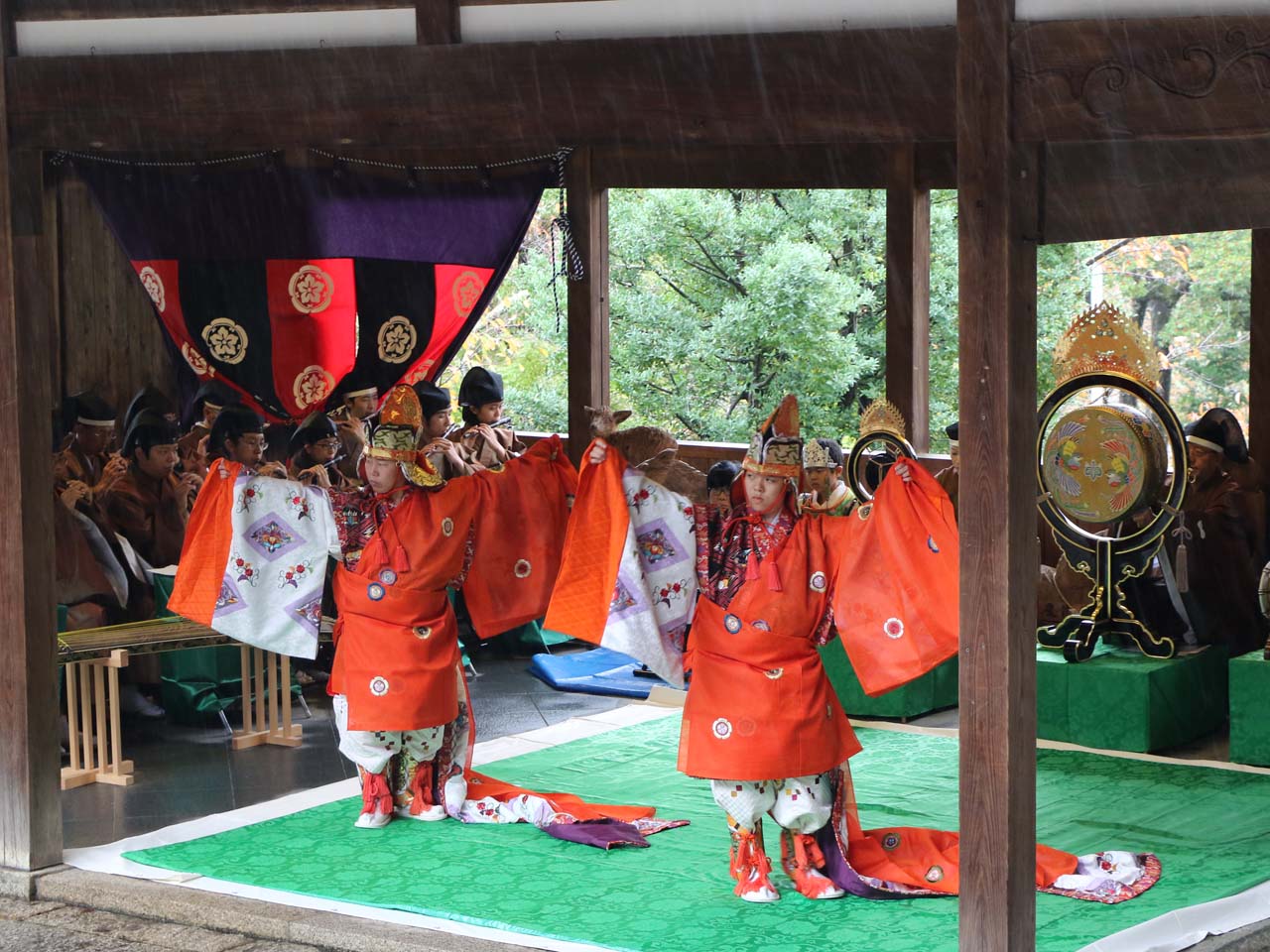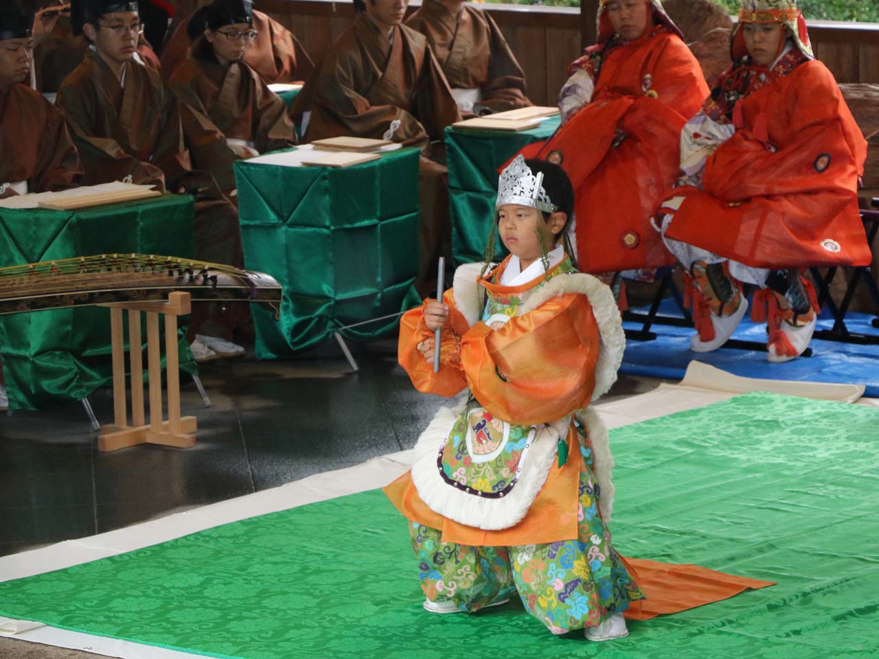 榊葉雅楽会と浪速学園高等学校雅楽部の合計20余名による雅楽の演奏の中、左舞は賀殿急、右舞は落蹲が奉納されました。